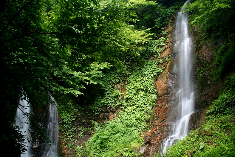 落差:五色の滝6m、夫婦(めおと)滝15m、大滝10m、蛇歯見の滝35m