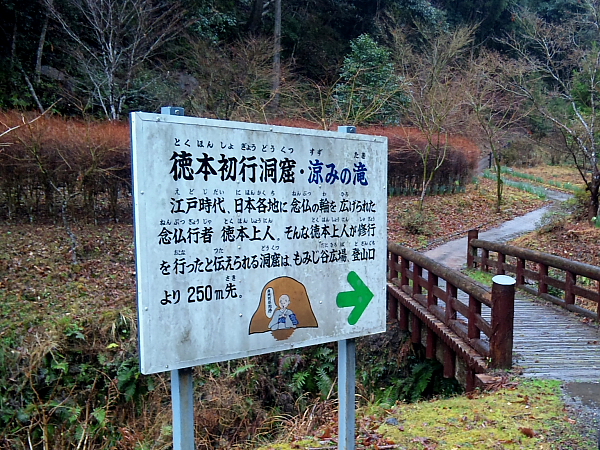 少し上流の大きな駐車場から吊橋を渡って「涼みの滝」8:10〜18を終え、更に集落の奥の「大滝」を目指す。