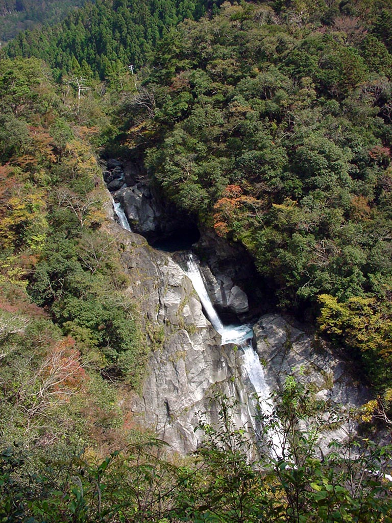 轟の滝 2004/11/21 高知県香美市香北町猪野々 落差:82m(3段) 長瀬ダム>物部川の支流日比原川、香北町のシンボルとして大切に管理されている様子が窺われた。 同名の滝は方々にあり100選と区別できない人もいるようだ。 徒歩10分の谷の上の観漠台から観る滝も美しいが、更に坂を降りた滝壷から観る滝は圧倒的で感動で震えるように滝音が轟く、まさしく轟の滝だ。 滝壷の大岩の上で大爆音を物ともせずのんびりピクニックしている家族連れがいた。多分この子供たちは、成人してもこの轟く滝音を忘れないことだろう。 |