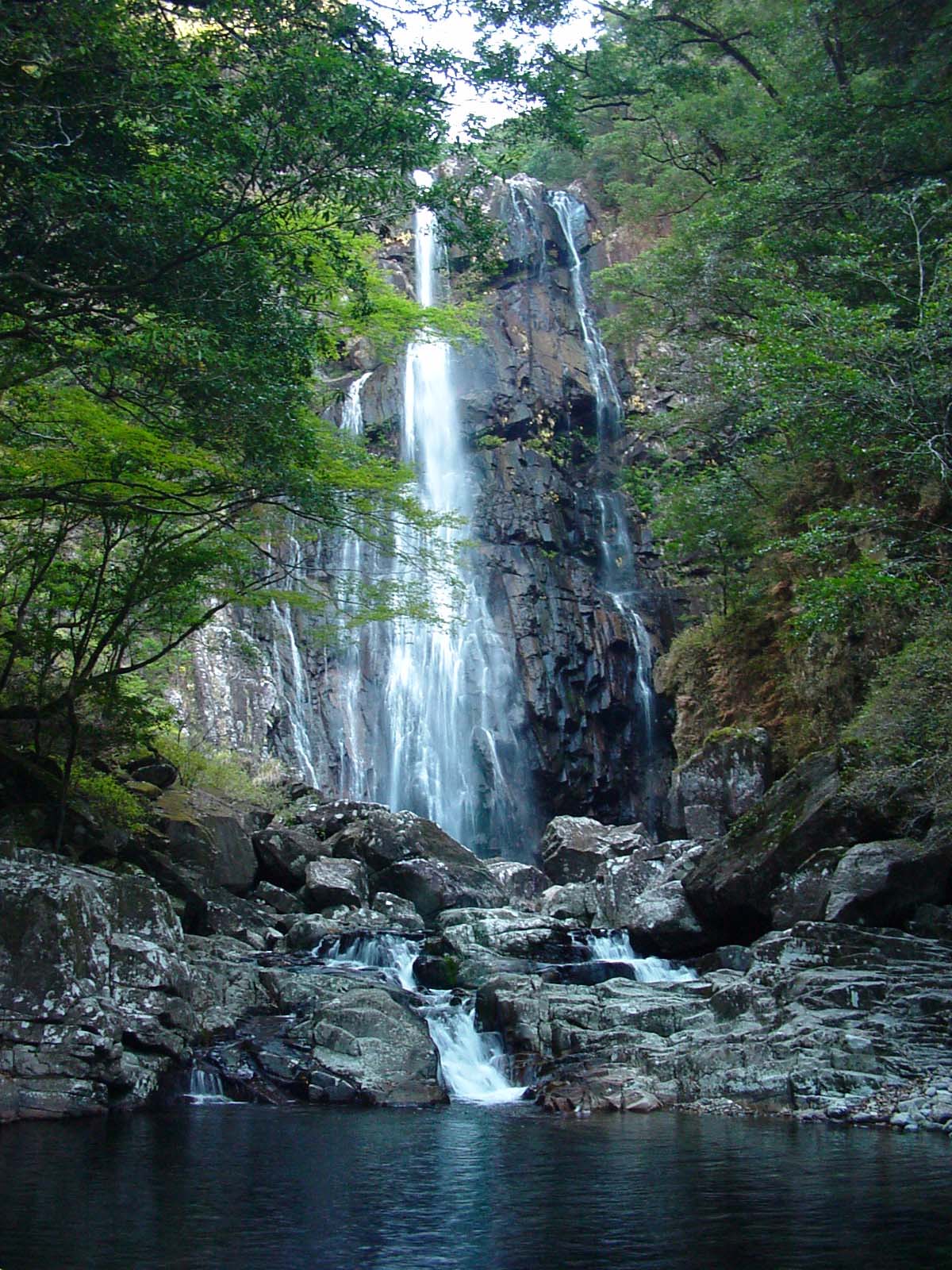 矢研の滝 2006/11/13 宮崎県児湯郡(こゆぐん)都農(つの)町大字川北尾鈴 落差:73m 幅:30m 滝の向き=南西 この日延岡のプラザホテル延岡リーグァをチェックアウトして9時半ころ滝に到着した。 鹿児島からきたという二人の老人が長靴姿で撮影していたがしばらくすると「あばよー!」と手を振りながら帰っていった。 滝の前は私一人の贅沢な空間になった。 遊歩道から滝壷までの200mくらいは大きな岩がごろごろと転がっている河原だ。 ほぼ中間あたりに岩のない大きな丸い滞溜ができていて滝の姿が映りこんでいる。 滝壷は濃いブルーの水を湛え落差のわりには静かな水音だ。 幅30mといわれる滝幅は細って水量は少ないほうではないかと思われるが、増水時は滝壷に近寄ることもできない形相を見せることだろう。 滝床の岩肌が適度に湿りを残して美しく輝く至福の時間は瞬く間に過ぎてしまった。 後ろ髪を引かれる思いで滝を後にしたのは正午に近い時刻だった。 次回は午後の陽射しを受けて光る「矢研の滝」を見にこよう。 |