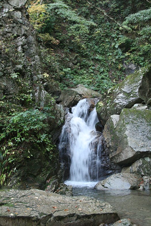 八ツ淵の滝(やつぶちのたき) 2007/11/10 「魚止の淵」 滋賀県高島市黒谷 静岡の”滝の引力”のイチローさんとJR西大津駅前で7時に落ち合うため電車で6時40分着。 ここんとこダウンしたPCの新設セットアップ、ネット接続などで寝不足気味で頭がぼんやりしている。 そんなこんなで一眼の取扱い説明書もまだよく読めていないのだ。 一眼撮りでは定評のあるイチローさんに会うのはいい機会だ。 また今夜は我が極貧APTに泊まってもらい続いて明日の天滝では広島の”花鳥風月庵”のはじめさんとも合流して早朝の虹撮りを目論んでいるのだ。 はじめさんも一眼撮りでは定評があるので両師匠が揃うことになる。 7時の約束だが遠距離運転でそんなにドンピシャに着くはずもないだろうと降水確率が心配の空を見上げていると見覚えのある車が私の前に停まった。 スルスルっ〜とウインドウが開いて「おひさしぶりです〜」と6月はじめの早戸大滝・棚下不動滝以来のイチローさんの元気な声。 携帯の時計をみるとピッタリ7時だ。 |