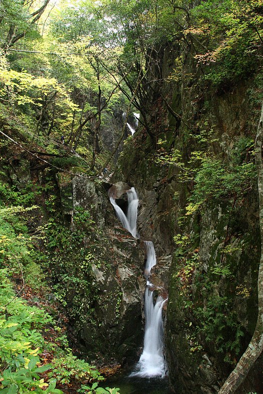 八ツ淵の滝(やつぶちのたき) 2007/11/10 「屏風ケ淵」 滋賀県高島市黒谷 10時20分屏風ケ淵到着。 その上流に見えているのが貴船ケ淵の淵頭だ。 どうも貴船ケ淵で先客が多く停滞しているようだ。 写真撮影でなく渡渉が原因のようだ。 我々はどちらが原因でも人を写しにきたのでないので一時休憩モード。 「スミマセ〜ン シャッターおねがいします」 大男の太った白人2人と東洋人のパーティーだ。 出してきたカメラが雑誌のおまけのようなちっちゃいの。 大男写るんかいな〜? やさしいイチローさんが対応。 「はい、チーズ!」 ニコっともしない大男。 腹へってんのか?? 結局、人を写した。 |