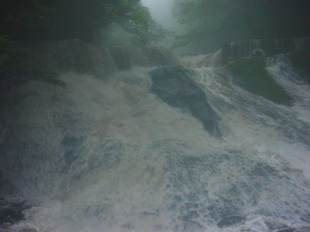 四十三万滝 2004/05/04 熊本県菊池市原/菊池渓谷 落差全長45m渓流瀑 阿蘇外輪山の北西部を源とする菊地川(菊地渓谷)にかかる滝。 渓谷には大きな滝はないが、渓谷のいたるところから湧き出る伏流水、ダイナミックな造形美、夏の涼や森林浴、秋の渓流に映える紅葉がとりわけ美しいといい駐車場の確保が困難な九州を代表する景勝地である。 名前の由来は昭和9年、九州日々新聞社が景勝地募集を行い、第1位43万票になったことからとも、また1日の平均水量が43万石(約7.8万トン)と変わらないからとも言われる。 この日九州中南部は前夜から嵐のような風雨に見舞われ四十三万滝も荒れ狂っていた。 後日のニュースによると屋久島で沢登り中の男女3人が川に流され行方不明になっていたのだ。 |